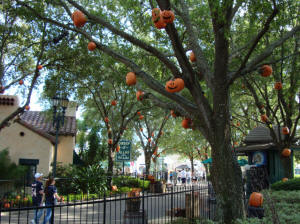 Notice the bundle of cable going up the tree trunk to power the pumpkins hanging from the branches.